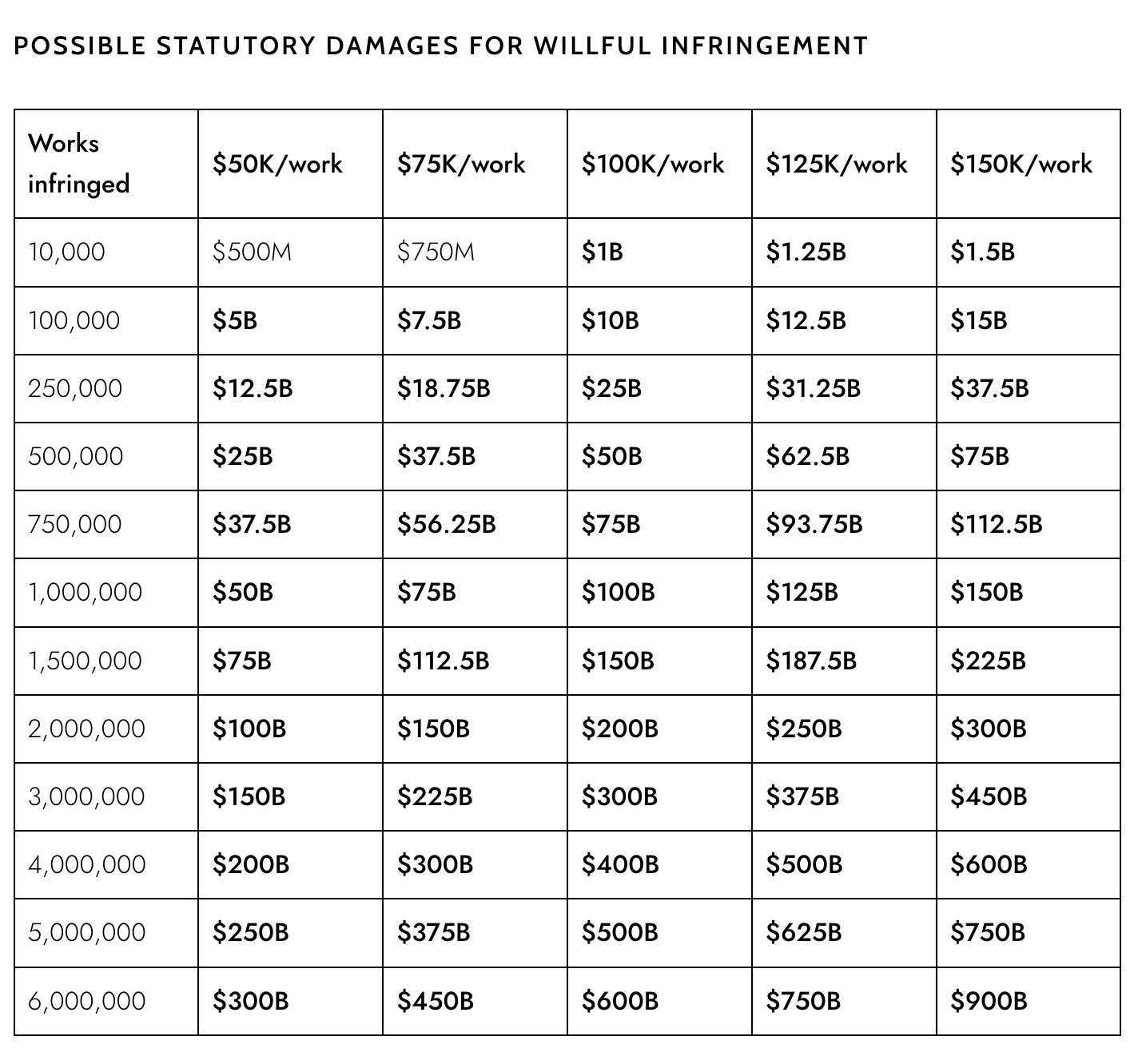 This could be… substantial. The ruling opened the door to a class action lawsuit. Damages depend on how many works are ruled to be in the class (not all of the books will have been published in the US or registered with the US Copyright Office), but given that it’s likely that there are at least a few million eligible books, damages could easily top $1 billion… at the lowest possible level of statutory damages. If the court rules there was “willful infringement,” damages could approach a trillion dollars at the highest possible end. Anthropic is valued at $100 billion, makes $3 billion in revenue annually, and would have to have cash on hand for damages.